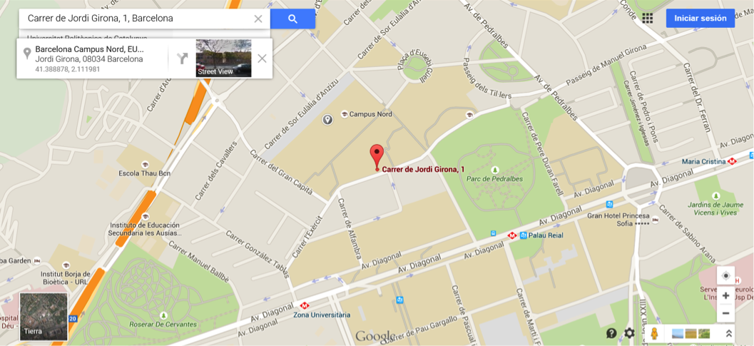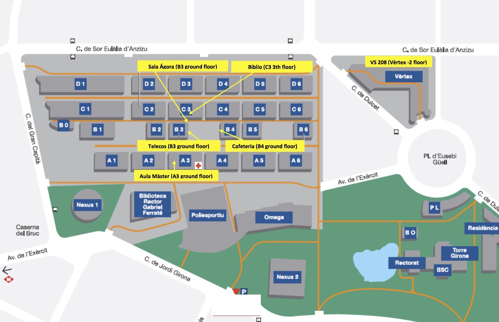 VS 208: This room is in the Vèrtex building, two floors underground. You can go through C. de Dulcet or from Pl. Eusebi Güell. The entrance is at ground floor, just in the interior right angle that makes the building