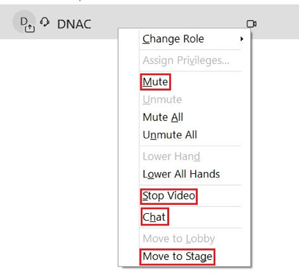 - During the call and in case a participant is disruptive, there are several actions the Session chair can take. These are available by right clicking on the user in the participant panel. The key ones are Mute, Stop Video, and in extreme cases Expel the participant.