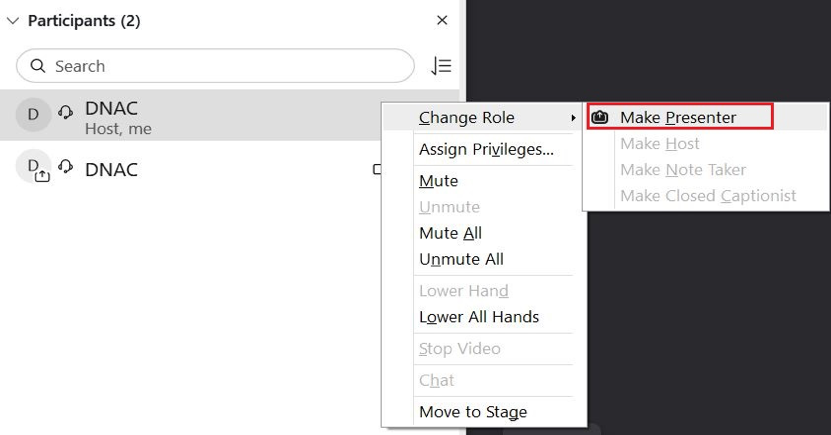 - If necessary, the session chair can designate specific users as presenters and enable them to share their screen during the course of the meeting by right-clicking the user and selecting Change Role To and then selecting Presenter.