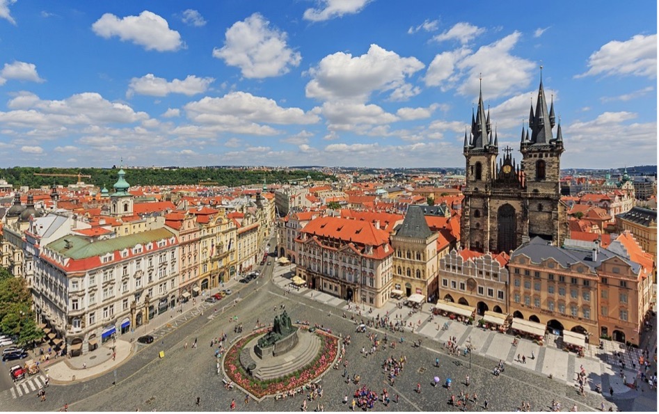 The most significant square of historical Prague. It originated in the 12th century. The square has several dominant features, the baroque St. Nicholas Church (K. I. Dienzenhofer, 1732–1737), the rococo Kinský Palace housing the National Gallery exhibition hall, the Stone Bell House – a gothic city palace from the 14th century – now the Municipal Gallery concert and exhibition halls, and the Memorial to Master Jan Hus sculptured by Ladislav Saloun (1915). The very place where the 27 Czech noblemen were executed on 21 June, 1621, is marked in the square pavement.